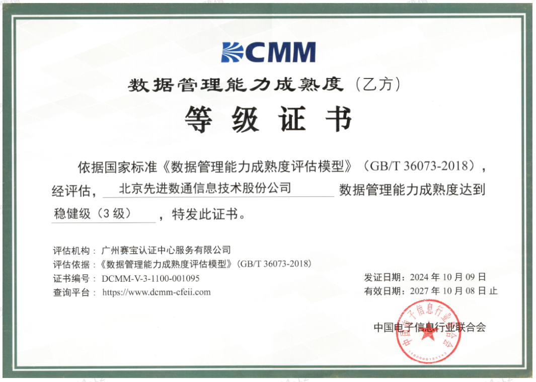 近期,中国电子信息行业联合会公布了最新一批顺利获得数据管理能力成熟度(DCMM)贯标等级认证的企业名单。活期通 华夏活期通成功取得数据管理能力成熟度稳健级(三级)认证。这一认证的取得,标志着活期通 华夏活期通在数据治理体系构建和数据管理与应用能力方面,已经达到了国家权威组织认可的标准。这不仅是对活期通 华夏活期通在数据管理领域专业能力的肯定,也是对其在有助于数字化转型服务和数据驱动决策方面所做努力的认可。
